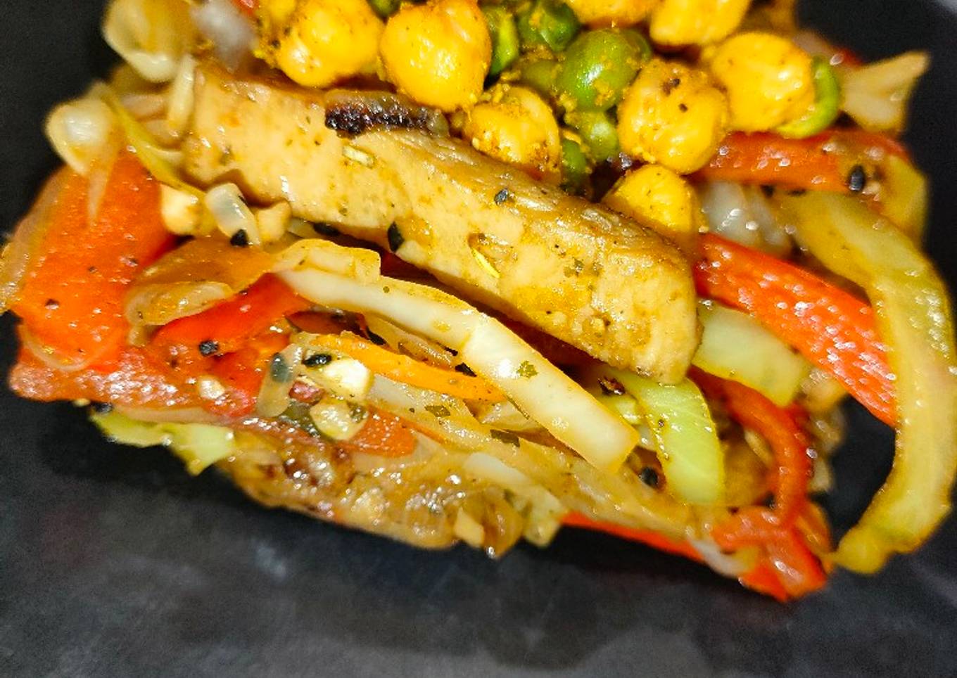 Aprovechamiento total de verduras y el topping de garbanzos que hice el otro día. Le he añadido Heura que tenía en la nevera, que siempre que se me olvida sacar del congelador algo de proteína me salva!