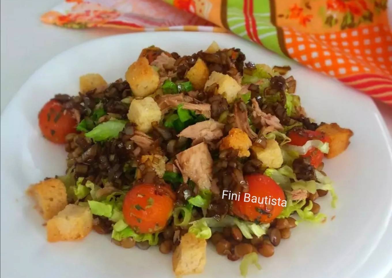 - Cortamos la lechuga en juliana y reservamos picamos en dados chiquititos la guindilla, y desmigamos el bonito, nos disponemos a emplatar poniendo en el plato como base las lentejas añadimos por encima la lechuga el bonito desmenuzado repartimos trocitos de guindilla y le añadimos los cherrys, incorporamos los picatostes y aliñamos con la salsa del puerro