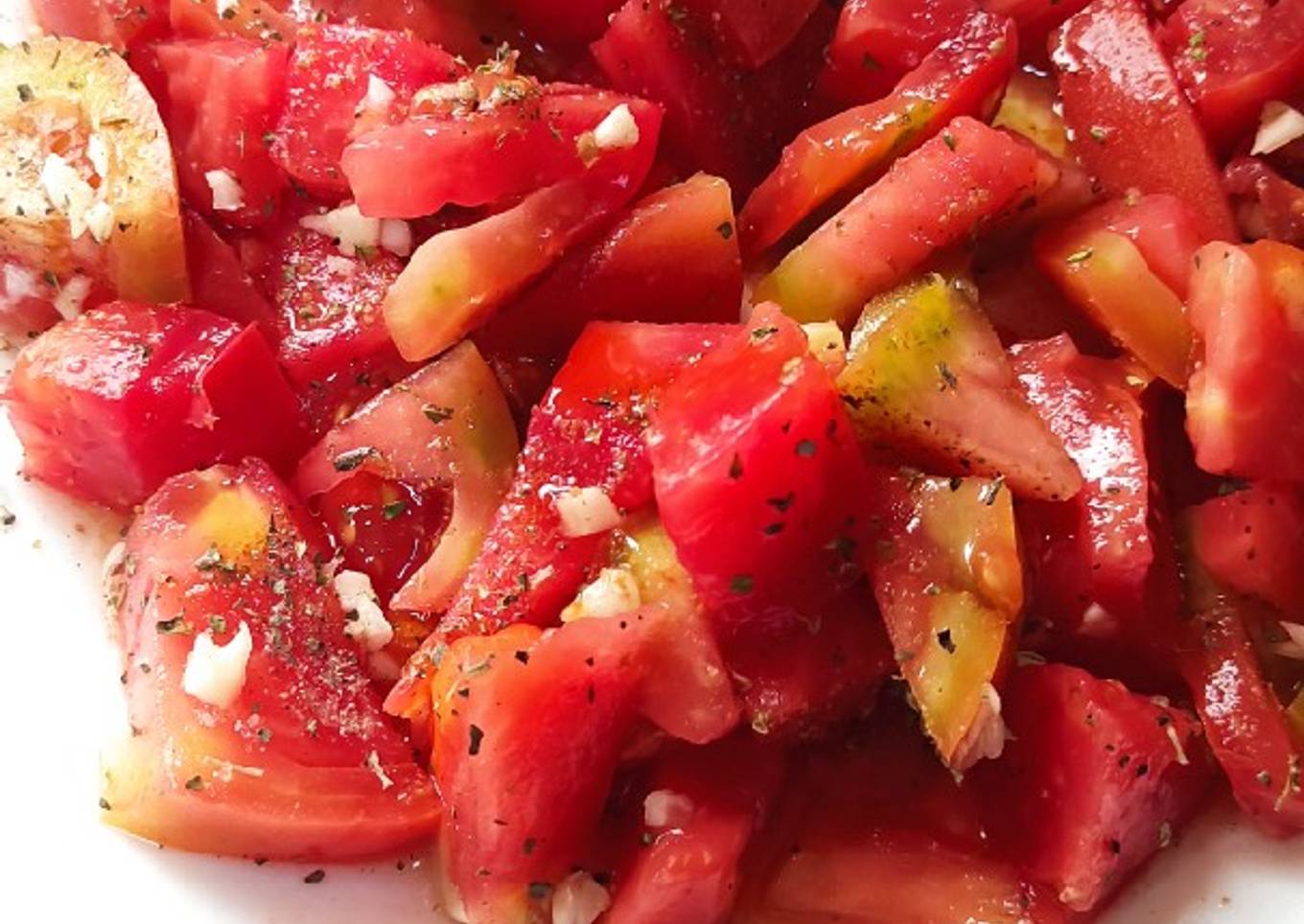- A los tomates le añadimos el resto de los ingredientes y decoramos con los ajos picados, ojo, que lleve ajos, pero una cosita moderada que después hay que besar a la suegra.