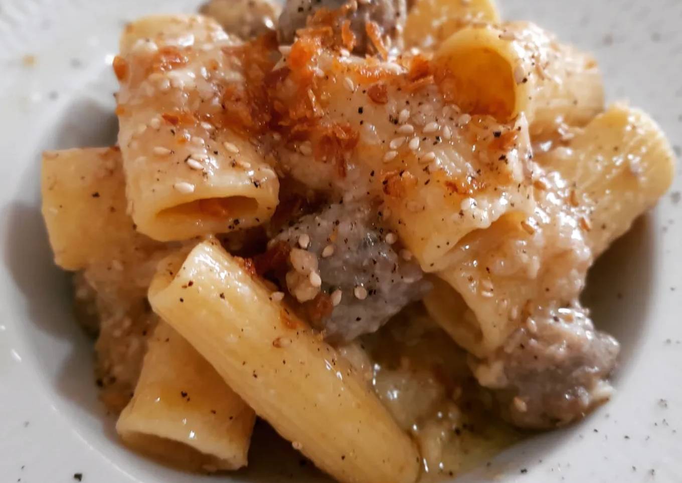Rigatoni con butifarra en salsa de ajos escalivados y tahini
