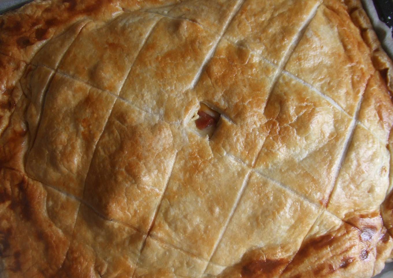 - Tapar con el queso. Dejar un borde libre para cerrar la tarta. Colocar el resto del jamón. Hacer un agujerito en el centro de la otra plancha para que salga el vapor. Formar unas marcas con un cuchillo afilado sin llegar a cortar la masa. Tapar la tarta con esta plancha, cerrar bien y pincelar con el huevo batido. Llevar a horno precalentado a 200º hasta que este el pastel dorado y cocido.