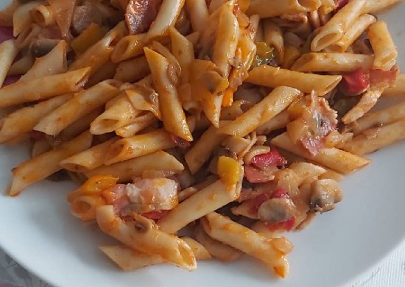Macarrones con verdura, bacon y queso