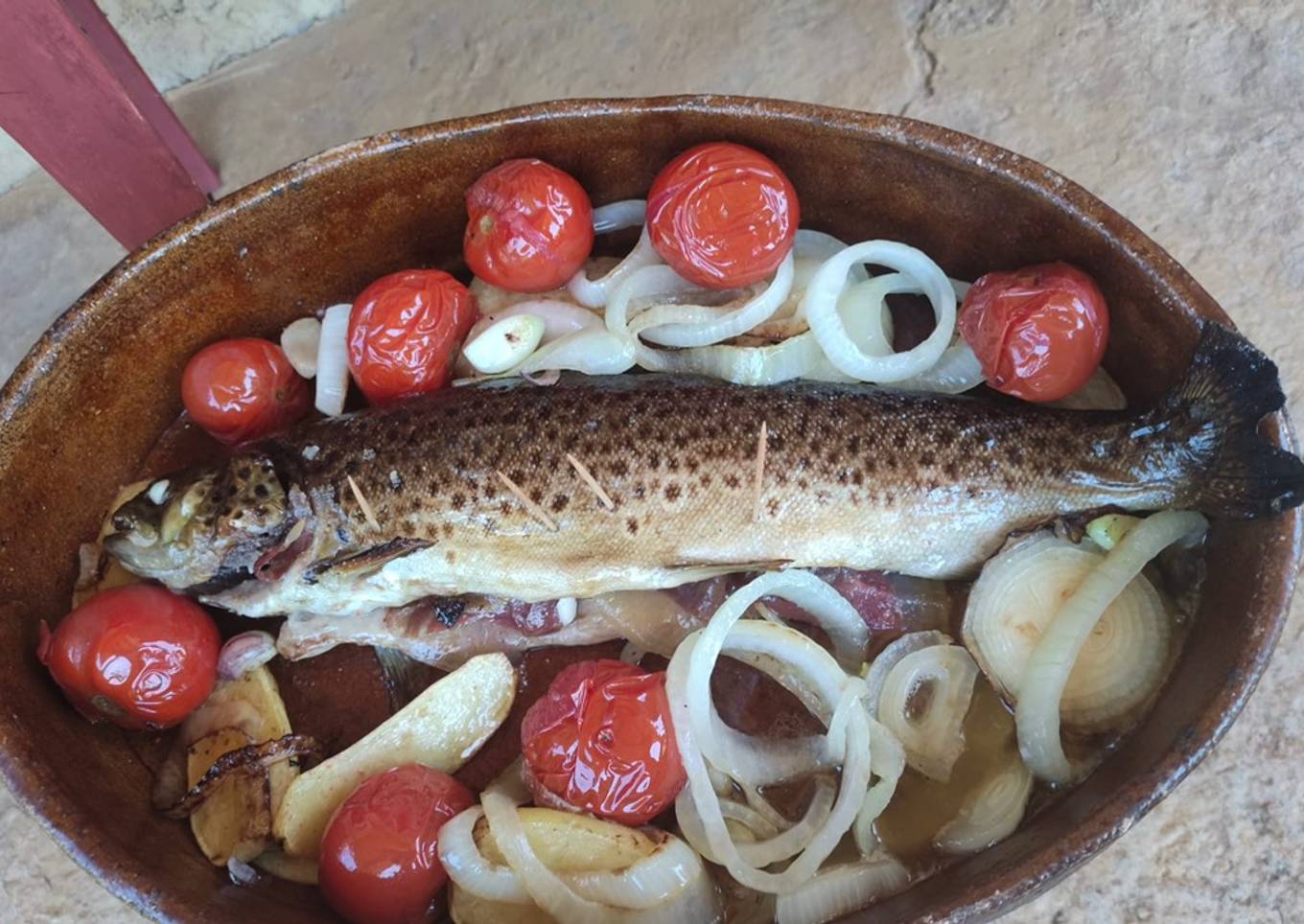 Trucha rellena con verduras y patatas
