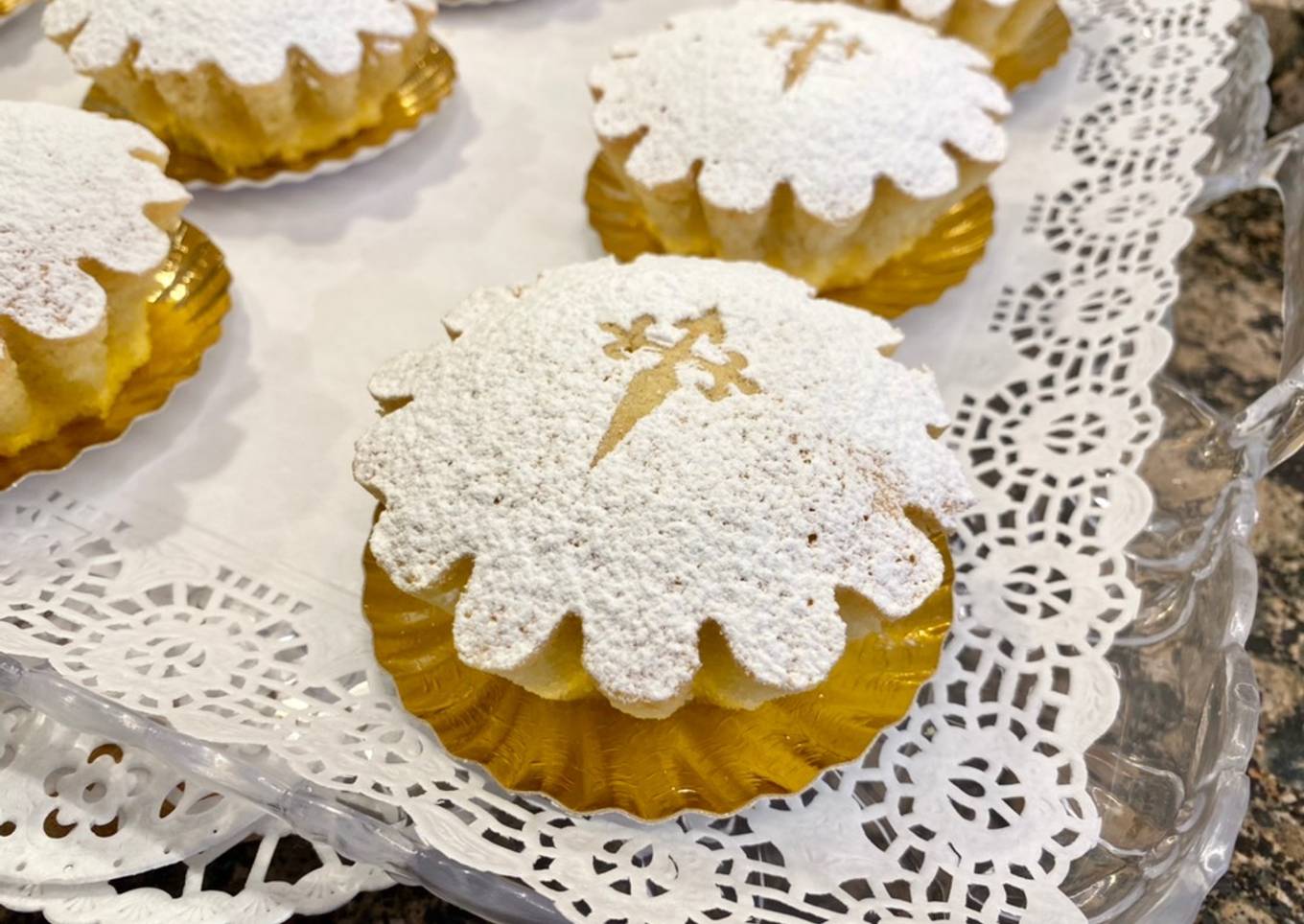 - Poner encina de cada pastelito la plantilla De la Cruz De Santiago, espolvorear con sucrafor glas (previamente hemos molido sucrafor granulado)