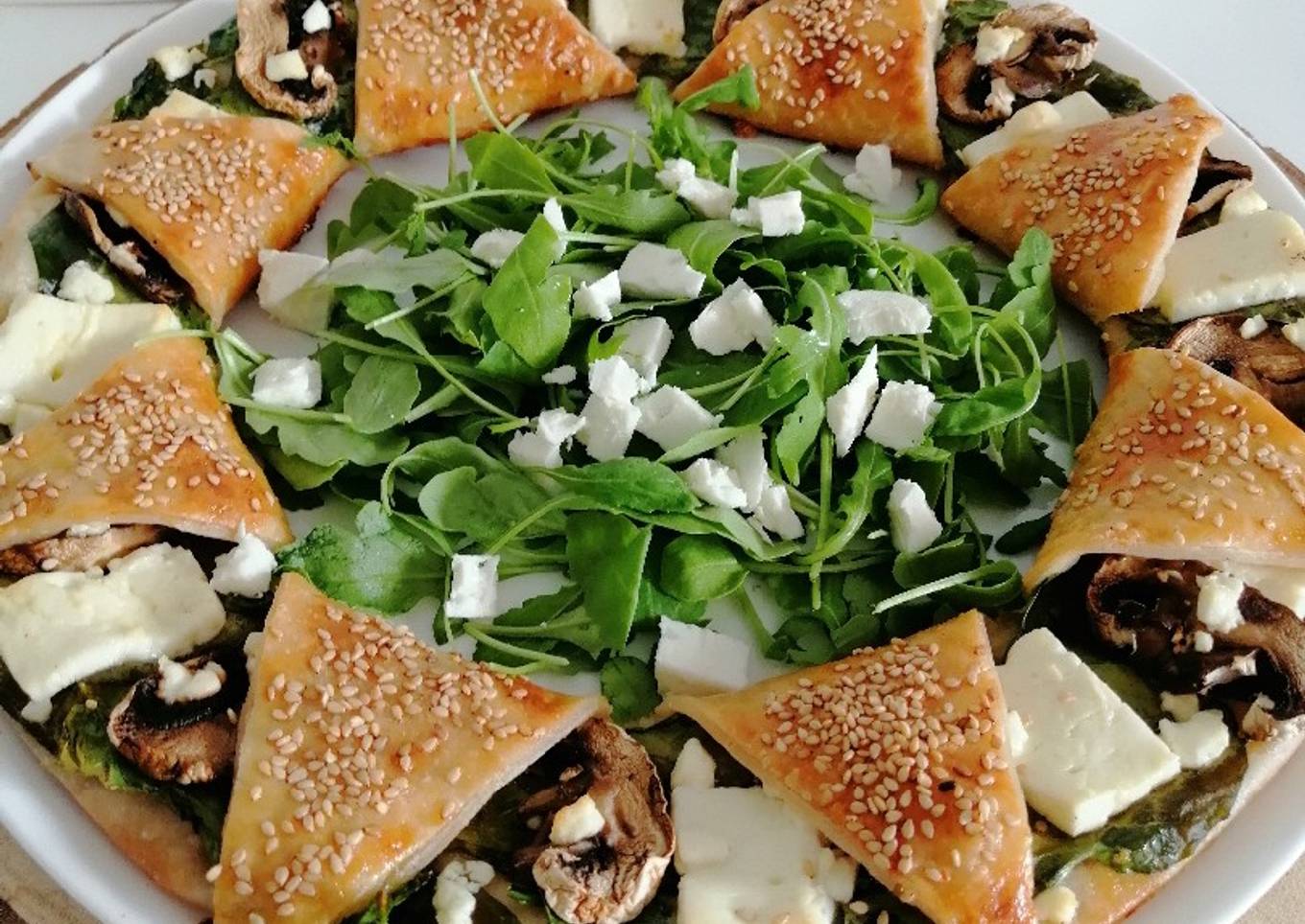 - En la parte de la masa que no hemos cortado, poner las espinacas, los champiñones con un poco de sal (el queso feta ya aporta sal) y pimienta negra recién molida. Intercalar los trozos de queso feta