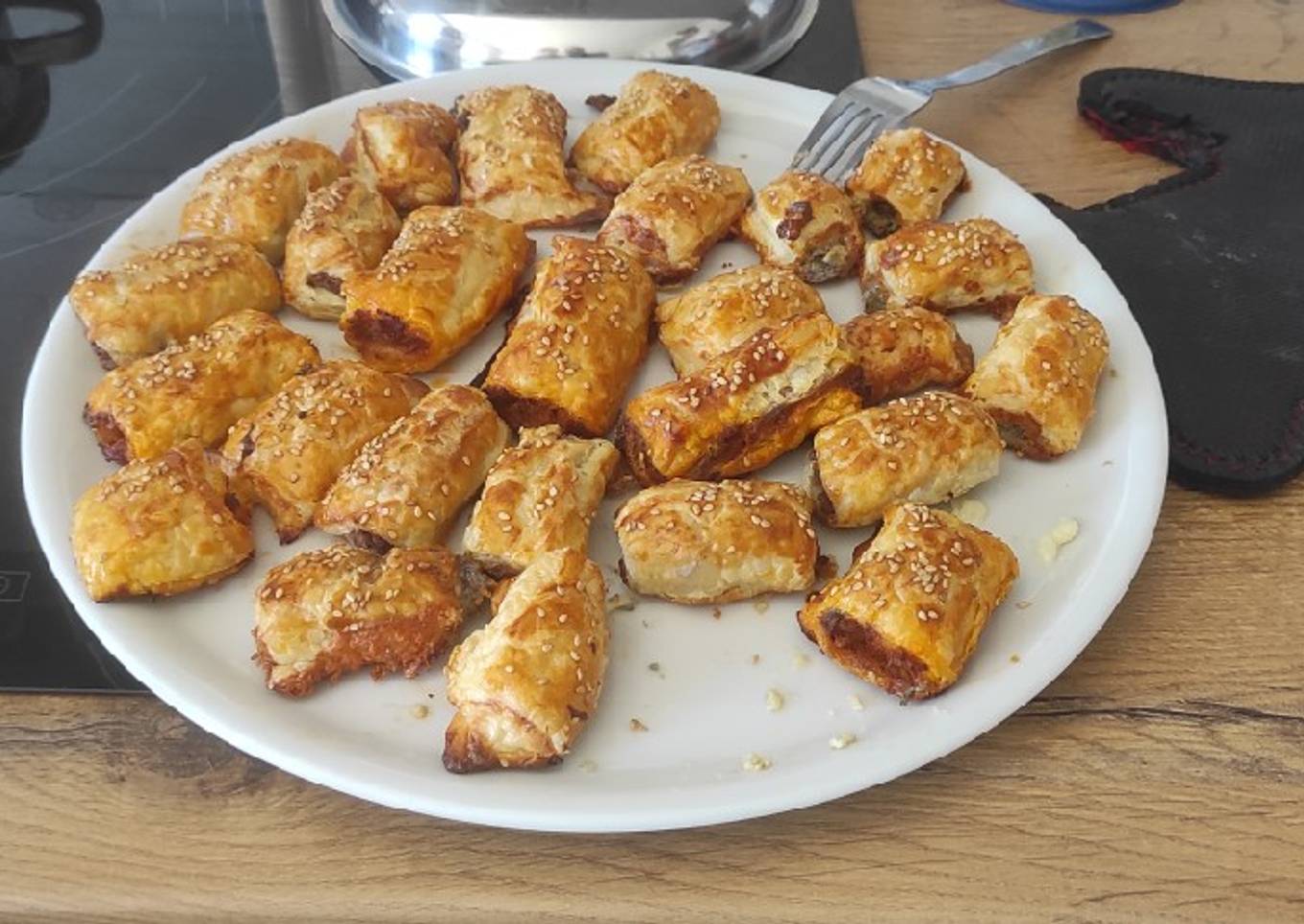 - Enrollar los carriles con cuidado de que no se rompa el hojaldre y usando el huevo como pegamento.