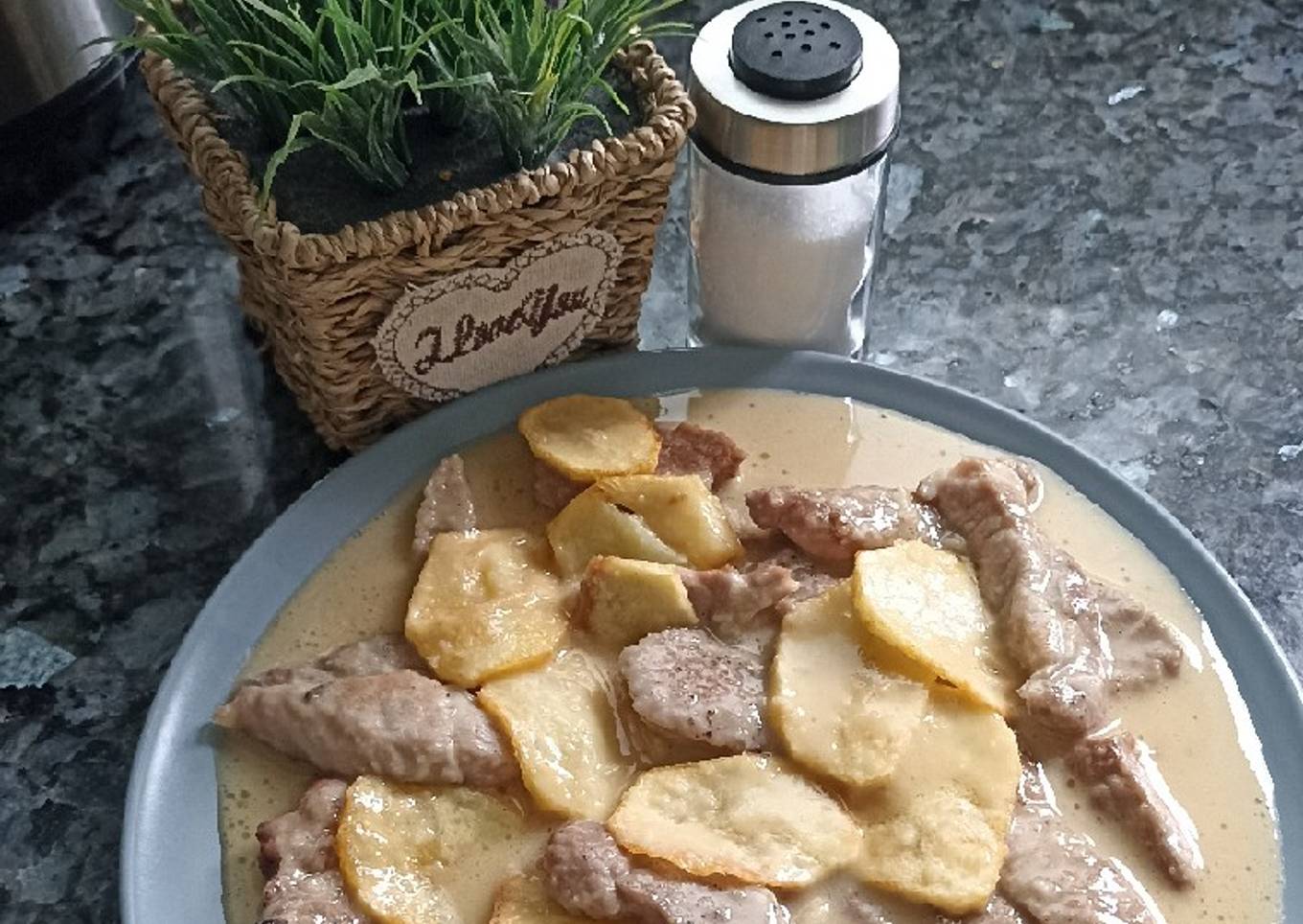 Hacer la patata panadera. - Incorporar en una fuente la carne, las patatas y verter la salsa encima.