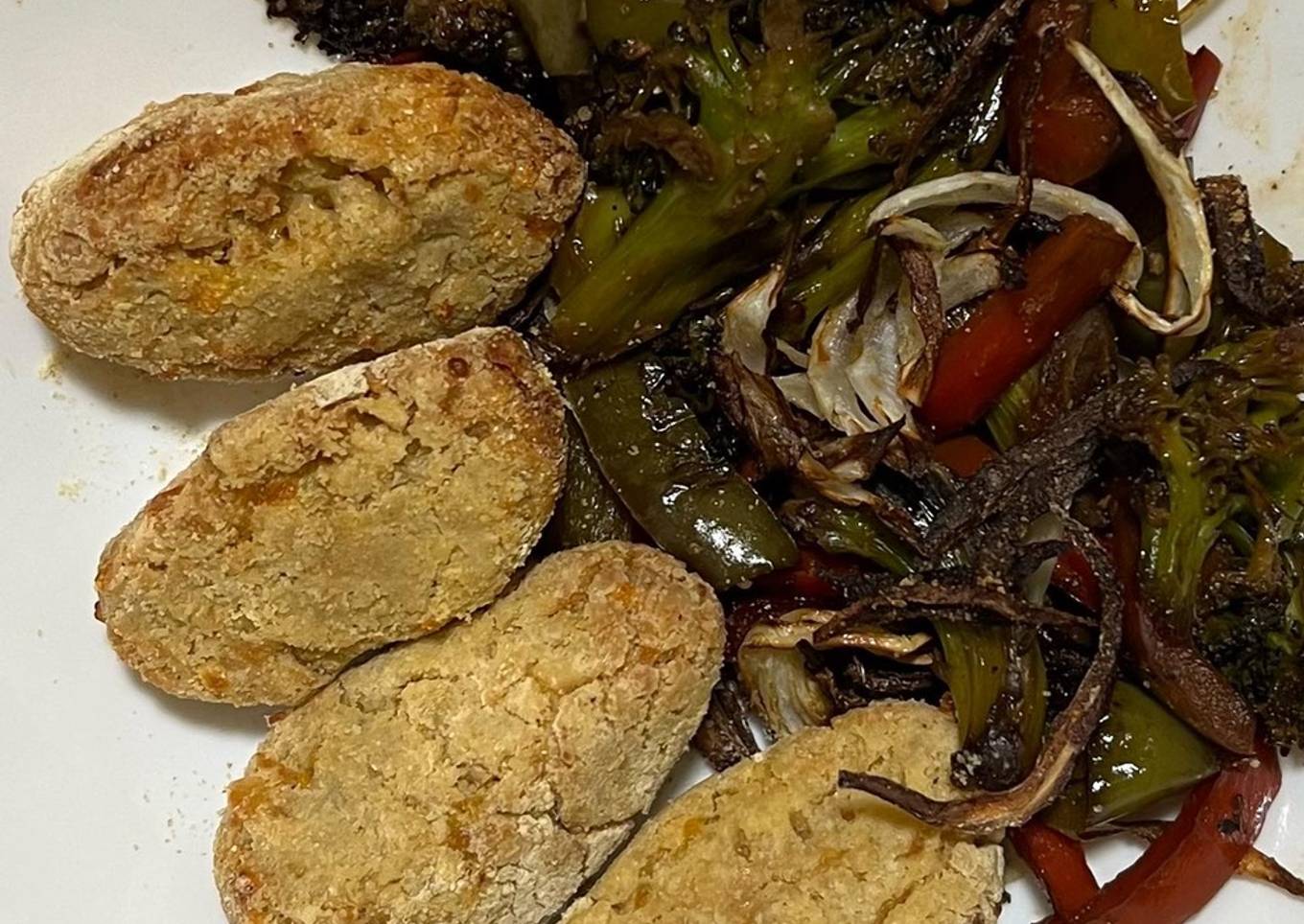 - Guarnición. Brócoli, pimiento 🫑 y pimiento rojo, y más cebolla