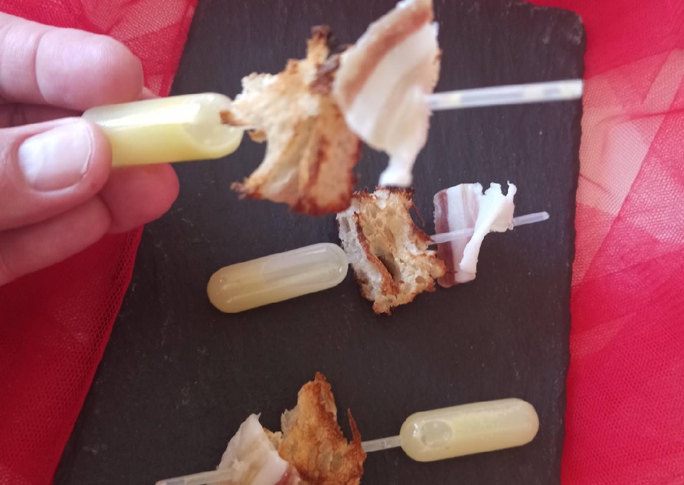 - Pinchar con la pipeta (ya llena de guindilla) un trozo de pan y rematar con una lonchita de tocino. Que aproveche!!